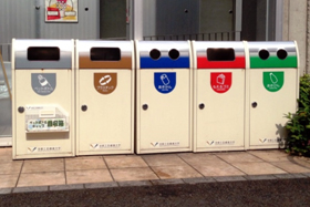 学内に設置されている分別回収用のごみ箱 廃棄物の削減や再資源化を目的に設置された