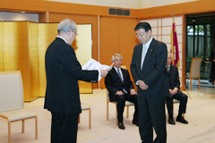 | 山田啓二京都府知事に寄附目録を 授与する稲盛和夫名誉会長 |
