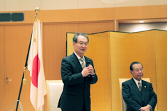 | 出席者による集合写真 | 古山正雄学長の挨拶の様子 |