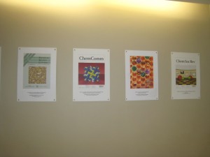 リーズ大学化学科の建物内にあるChaston Chapmanラウンジには化学科内から投稿された論文の表紙が掲示されている。研究者にとって投稿した論文が雑誌の表紙に採用されることは大変名誉なことであり、リーズ大学化学科内の研究レベルの高さに圧倒された。