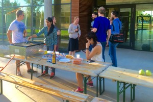 週に一度のミーティングではほぼ全員が参加して研究室運営上の情報交換及び確認を行うとともに、論文発表内容についての報告などを行っています。個々の研究内容についてはグループの人数が多いためにそれぞれが担当教員と個別にディスカッションするスタイルになっています。研究活動の合間に、みんなで建物脇の広場などを使ったBBQや、エクスカーションに出かけるなどの行事をおこなうこともあります。