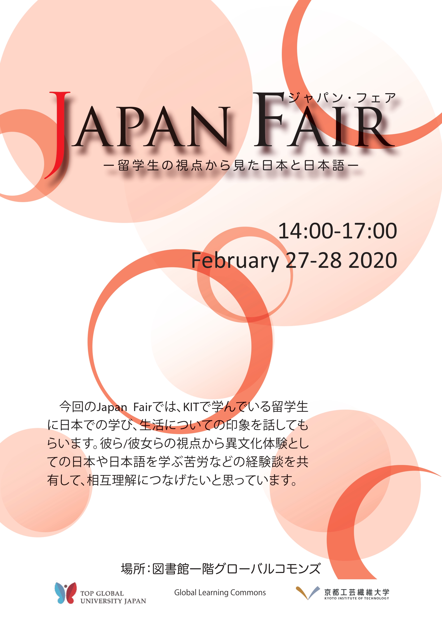 グローバルコモンズでは、2月27、28日(14:00~17:00)の日程でジャパン・フェアを開催します。本学の留学生に日本での学びや日本語習得の経験、そこで感じた文化の違いなどについて語ってもらいます。皆さんの参加をお待ちしています。