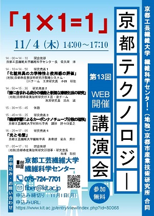 繊維科学センターと(地独)京都市産業技術研究所は、平成22年より技術及び研究に関する交流を行っており、定期的に「研究交流会」を開催しています。13回目となる今回は、「京都テクノロジー講演会」と名称を新たにし、新型コロナウイルス感染拡大防止のため、昨年に引き続きオンラインで令和3年11月4日(木)に開催しました。今回の講演会テーマは、本学が名称に「繊維」を戴く我が国で唯一の大学であり、また(地独)京都市産業技術研究所が公設試として「繊維」関連の体制が一番充実した機関であることから、「1×1=1」としました。