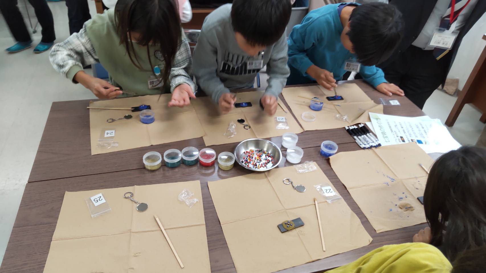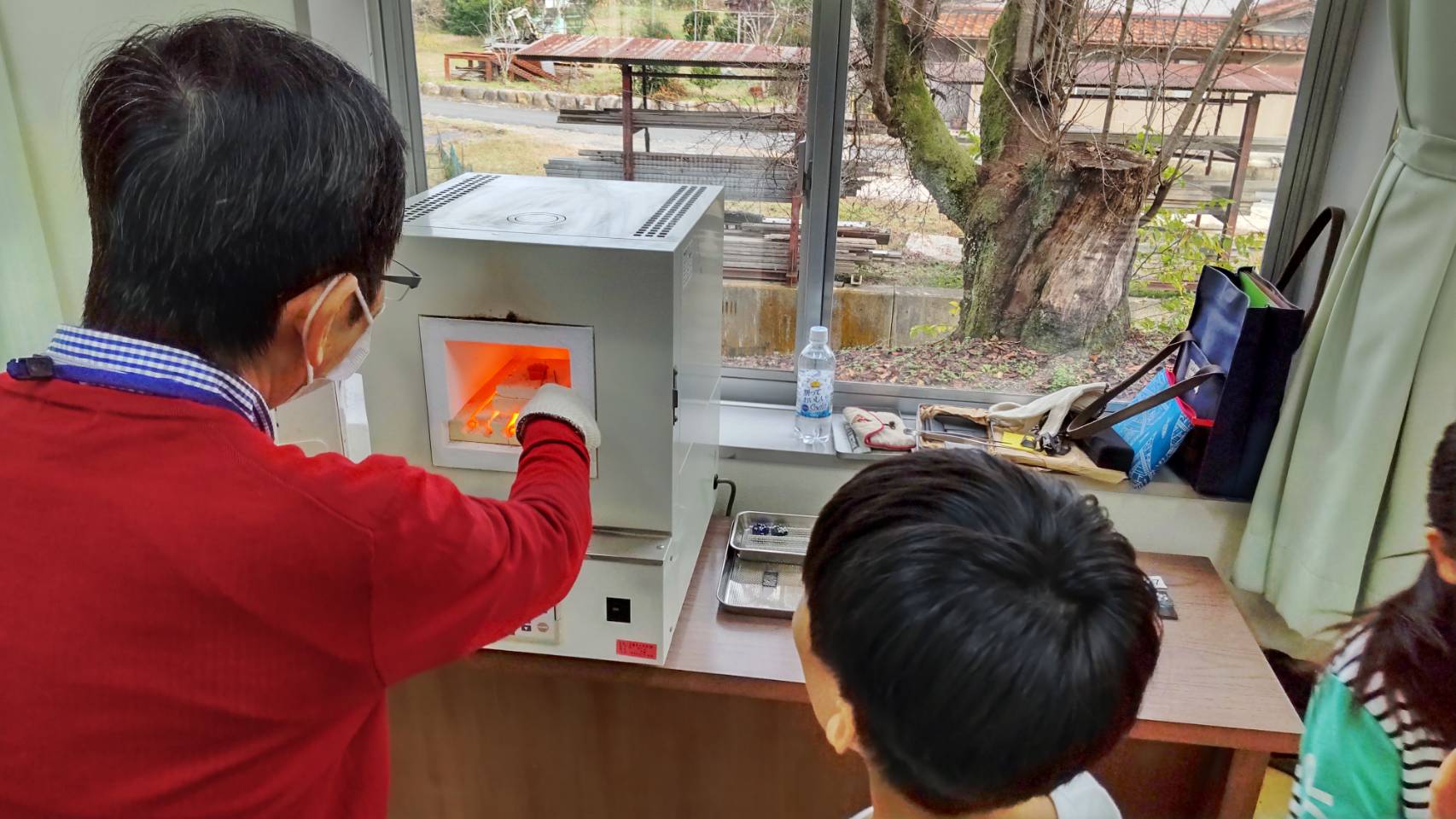 今回の出前講座は、足立馨 分子化学系准教授、塩野剛司 元材料化学系教授、兎谷和徳 元技術職員の協力を得て、「ガラスと金属がつくるアート-七宝焼きを作ってみよう!-」講座を実施しました。