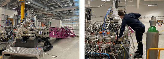 写真2(左) スウェーデン放射光施設MAX IVの高分解能共鳴X線非弾性散乱分光装置(VERITAS)。右奥に伸びる赤紫の部分は、アームと呼ばれる、中程に分光器、先端に検出器を備えた発光分析部。原理的にはアームが長いほど分解能が高い。VERITASのアームの長さは10mで、35meVの分解能をもち(今後更に高分解能化される予定)、X線吸収で励起された格子振動も検出することができる。最近の流行は、Naイオン電池の陽極材料研究で、電池の駆動時に陽極材料の中をどのようにNaイオンが移動するかを、陽極材料の格子振動を通して観測するもの。(右) 1年間一緒に研究したPhD学生のPontus君が分析槽に試料を挿入しているところ。Pontus君の研究テーマはNaイオン電池の陽極材料中の第一原理計算による物性予測と共鳴X線非弾性散乱スペクトル計算だが、理論計算だけでなく、チームの一員として測定実験も行う。