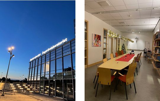 写真1(左) ウプサラ大学オングストローム研究所の玄関ホール外観と夜空。緯度が高いため、夏至に近いと22時でも明るい。(右) X-ray photon science divisionのゼミ室。毎週月曜日の全体ミーティングや火曜日のゼミに加え、論文がアクセプトされたときに皆に報告してケーキを食べて祝うイベント“Paper Cake”や、毎週水曜日のFeka (コーヒータイム)、金曜日のSalty Sticks (飲み会)が行われる。