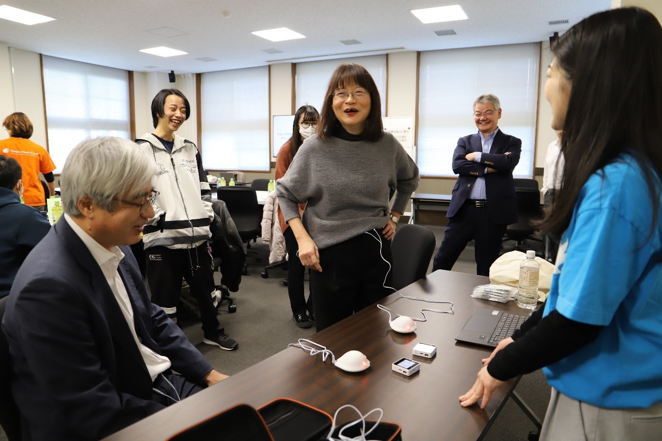 研修当日は、ピリオノイド(生理痛VR体験装置)を装着し、筋電気刺激(EMS)の発生により、生理時に生じる腹部の痛みの疑似体験を行うとともに、体験後に、本体験を踏まえて良い学習・労務環境にするための対策を考えるワークショップを行いました。また、吉本昌広 学長も本研修を見学した他、生理痛疑似体験にも参加しました。
