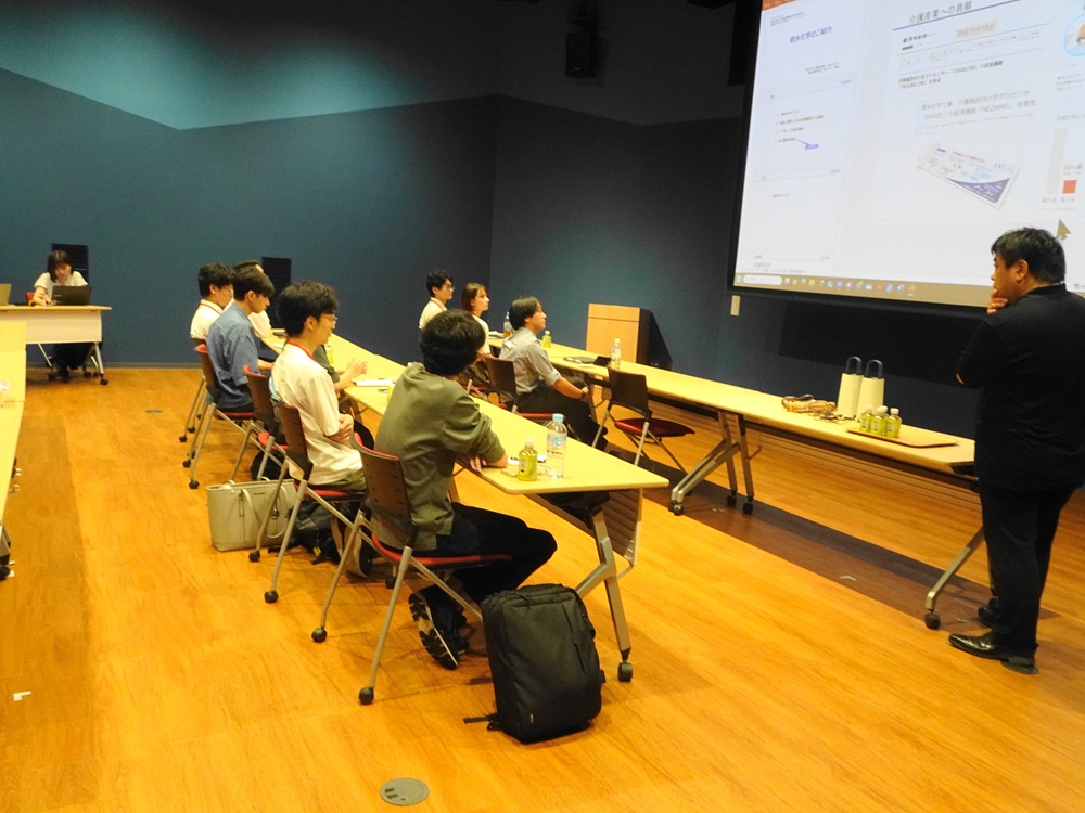 まず、今年、量産化を発表しているペロブスカイト型太陽電池を始めとする多くの最先端技術の取組みを見学させていただきました。その後のレクチャーでは、「6の基幹技術・28の技術プラットフォームに見られるシーズ」と「社会課題解決などのニーズ」がどのように結びついているのかなどについて、社史も踏まえてご紹介を頂きました。
