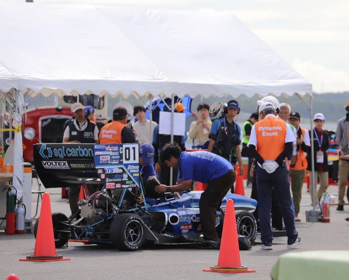 しかし、大会当初から順風満帆だったわけではありません。泉大津フェニックス多目的広場をお借りして走り込みを重ねたマシンでしたが、大会当日に不調が見つかり、得意としてきた動的種目で思うような結果を残せませんでした。首位チームとは一時40点差、オートクロス(直線・ターン・スラロームのコース走行性能を競う種目)も6位に終わるなど、チームの雰囲気は一気に重くなりました。