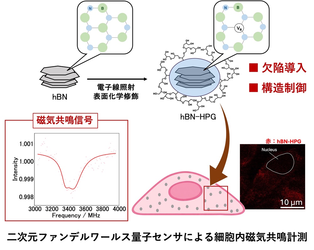 博士前期課程学生 下村鈴音さん、分子化学系 外間進悟 助教ら研究グループは、六方晶窒化ホウ素(hBN)注1)ナノ粒子を用いた新しい量子センサ注3)の開発に成功しました。本研究では、hBNナノ粒子内部に多数の「ホウ素空孔中心注2)」と呼ばれる欠陥を導入し、この欠陥の持つ量子特性に基づく蛍光信号を利用することで、光を使って周囲の微小な温度変化を検出できることを実証しました。さらに、二次元材料の欠点である「構造的に脆い」という性質をシリカ(酸化ケイ素)の薄膜でコートすることにより安定化し、その上に高分枝鎖ポリグリセロールを付加する二段階の表面修飾を施すことで、粒子同士が凝集せず水中で安定に分散し、タンパク質の付着も強力に抑制できることを確認しました。この表面修飾により、生体内のような複雑な環境下でもナノ粒子が量子センサとして機能することが可能となりました。実際に、調製したhBNナノ粒子をヒト培養細胞(HeLa細胞)内に取り込ませ、細胞内部から発せられる量子特性信号を検出することにも成功しました。二次元材料であるhBNに基づく量子センサが細胞内で機能することを示したのは世界で初めてであり、細胞内部の温度分布など物理量を非侵襲的に計測する新たな手法として注目されます。本研究成果は、量子センサを用いたバイオセンシングの可能性を大きく拡げるものです。