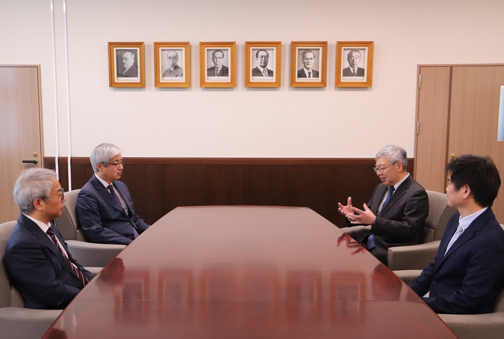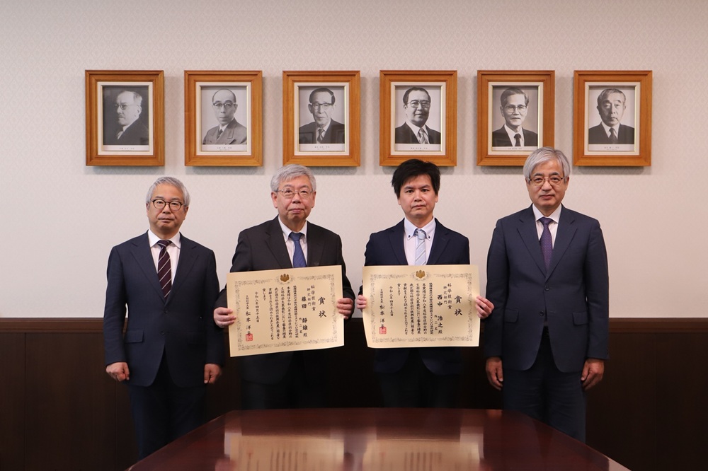 表彰式翌日には西中教授から吉本昌広 学長、増田新 理事・副学長へ受賞の報告が行われました。また、吉本学長とも研究交流を通じて親交があり、本学の客員教授としてサムコ辻理寄附講座の講師を務めている藤田静雄 名誉教授も同席されました。西中教授と藤田名誉教授は自身の研究業績を紹介するとともに、今後の抱負を述べ、吉本学長からは祝意とともに、さらなる研究活動への期待が寄せられました。