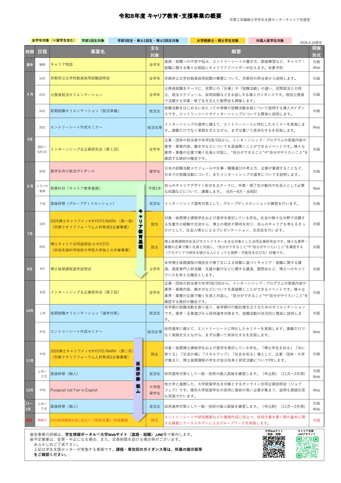キャリア教育、就職ガイダンス、模擬面接など、皆さんのキャリアプランニングと就職活動を支援する様々なイベントを開催しています。ぜひ積極的にご参加ください。