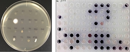 私の研究室では、イタコン酸を生産する微生物を効率的に土壌から探し出すための技術を開発しました。イタコン酸の末端二重結合の構造に注目し、この末端二重結合への特異的な付加反応である「チオール・エン反応」と「溝呂木・ヘック反応」を微生物の分離に応用しました。DISCOVERと命名した本技術では、まず、分離源である土壌をチオグリセロール入り寒天培地に塗布しイタコン酸生産菌をコロニーとして優先的に増殖させます。次に、分離した微生物の培養液をヨードベンゼンと反応させ呈色を調べることで、分離した微生物が作るイタコン酸の量を迅速に分析します。本技術は、簡便にイタコン酸生産菌を分離できる点で優れます。また、微生物の分離に上述の有機合成反応を利用した初めての試みです。